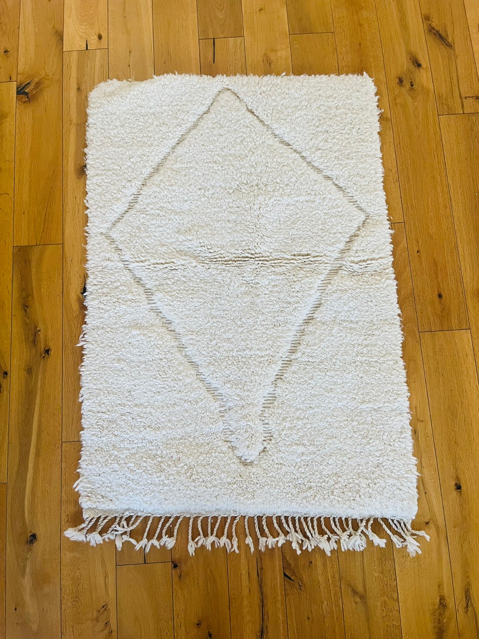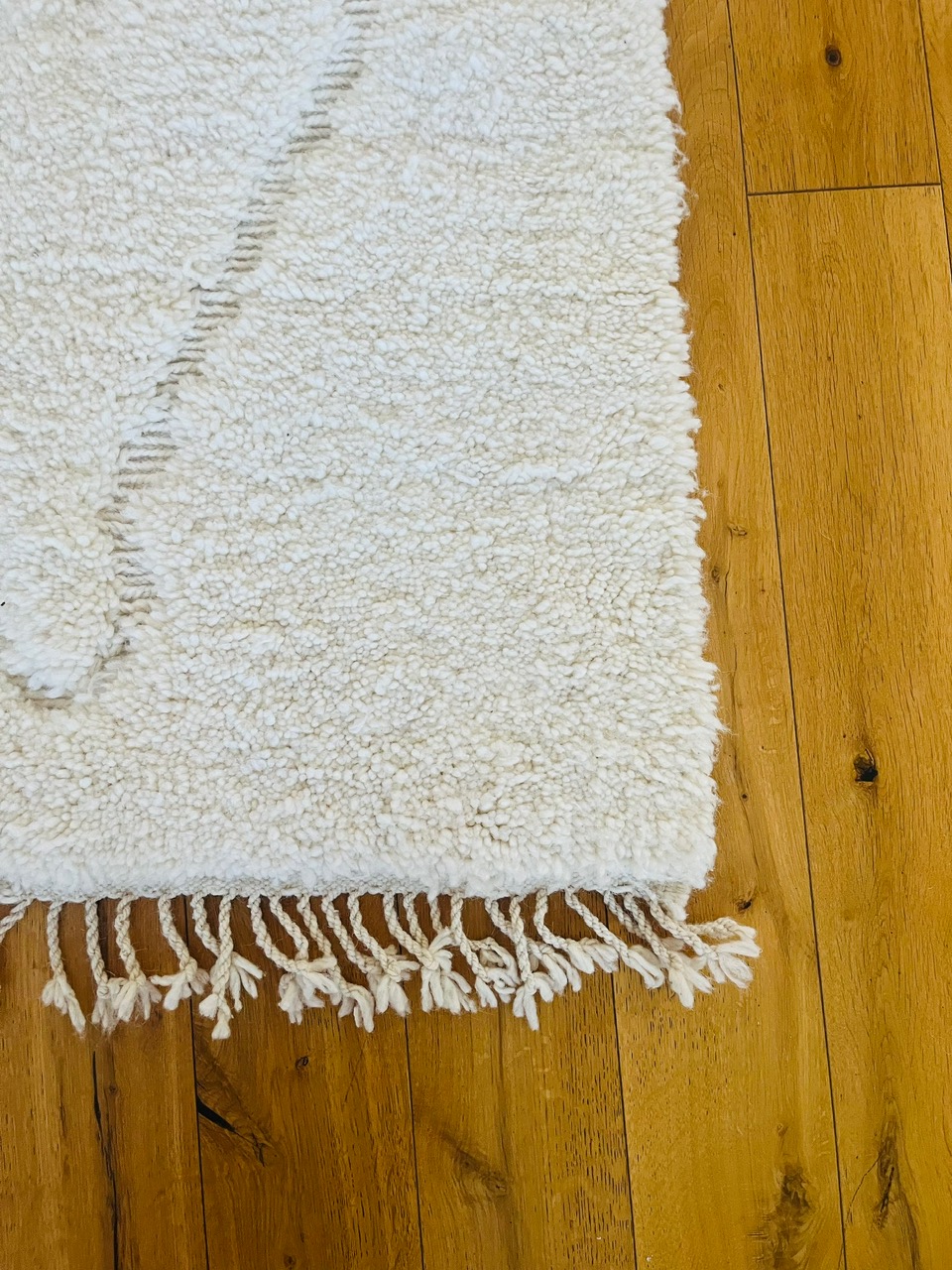 Der Berber Beni Ourain Teppich Junis aus Marokko, ist ein heller kleiner Teppich, mit einem unaufdringlichem Muster.